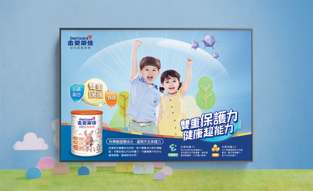 金愛斯佳講求專業負責的品牌價值,以科學驗證營養成分提升保護力的產品訴求,除了透過嚴謹的科學論點、詳實的研究報告來展示,銘島試圖建構更活潑吸睛的溝通元素,呼應活力、熱誠、關懷的品牌個性,貼合年輕媽媽客群理性認知產品成分功效之外,對於感性溝通溫度與視覺吸引力的偏好。